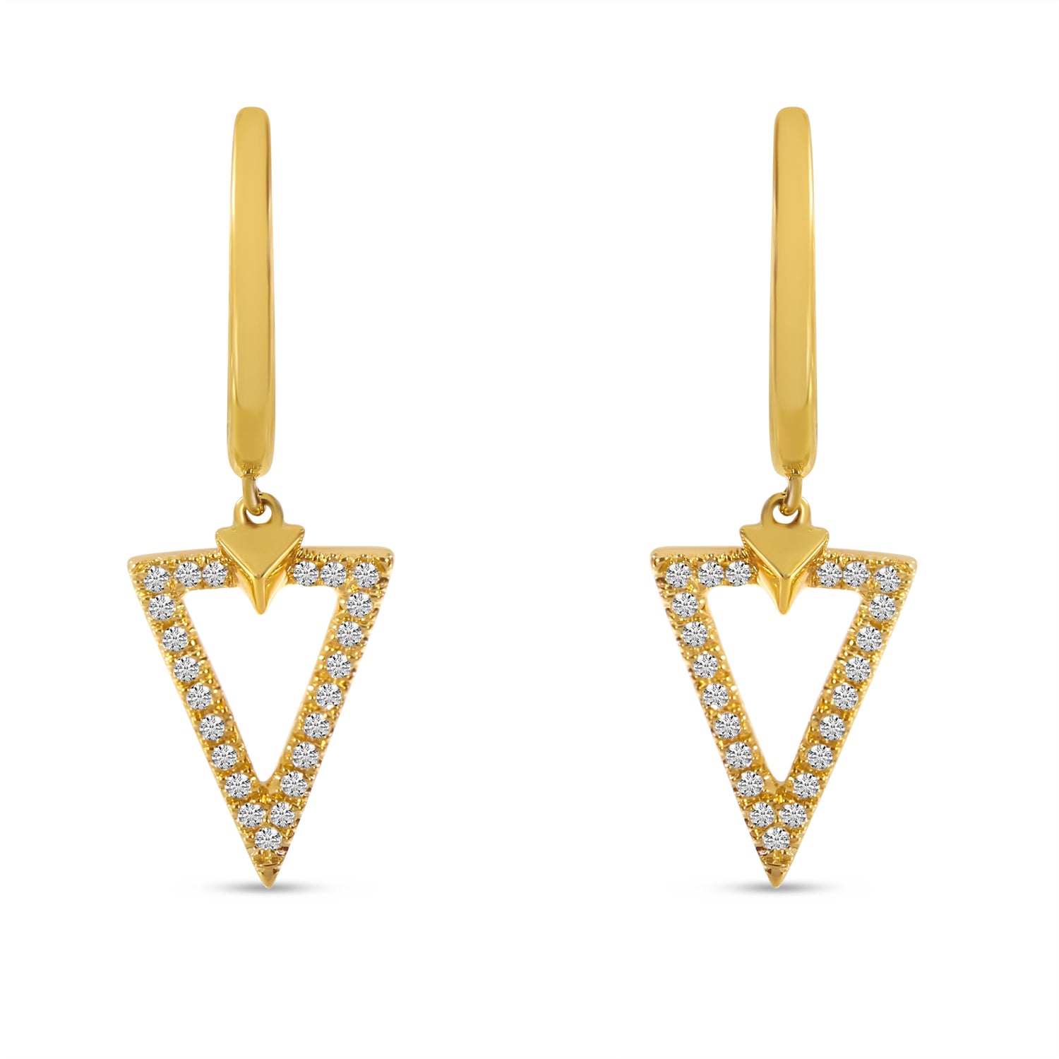 One pair (2) 14K diamond triangle dangle earrings prong set with (46) round brilliant cut diamonds 11/100CTW of fine (G-H) color and (SI) clarity.
