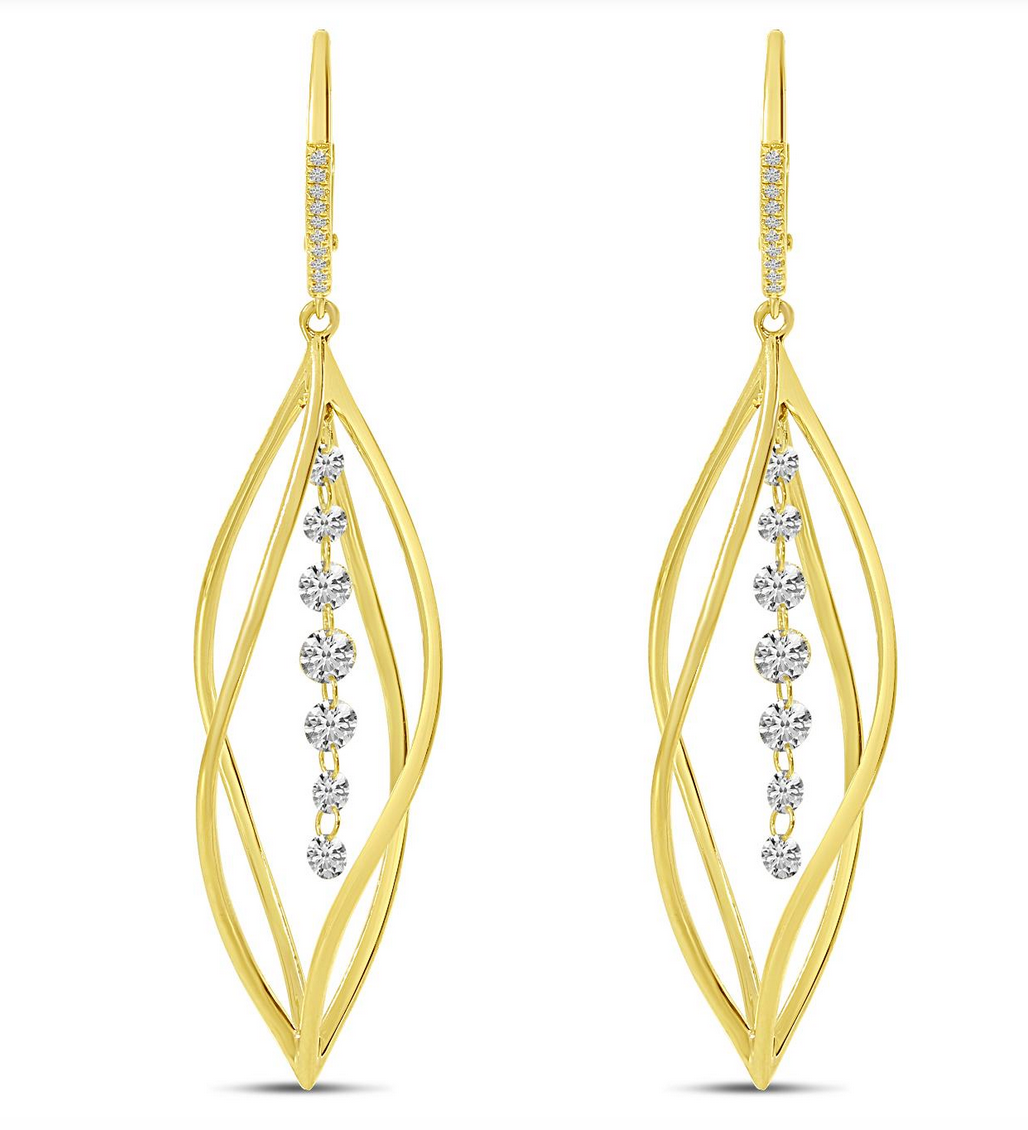 Introducing our 14K yellow gold floating 3D swirl earrings, adorned with natural round brilliant cut diamonds. The french backs feature (20) diamonds while the center boasts (14), totaling 96/100CTW of fine (G-H) color and (SI1) clarity. Feel elegant and unique with every wear.