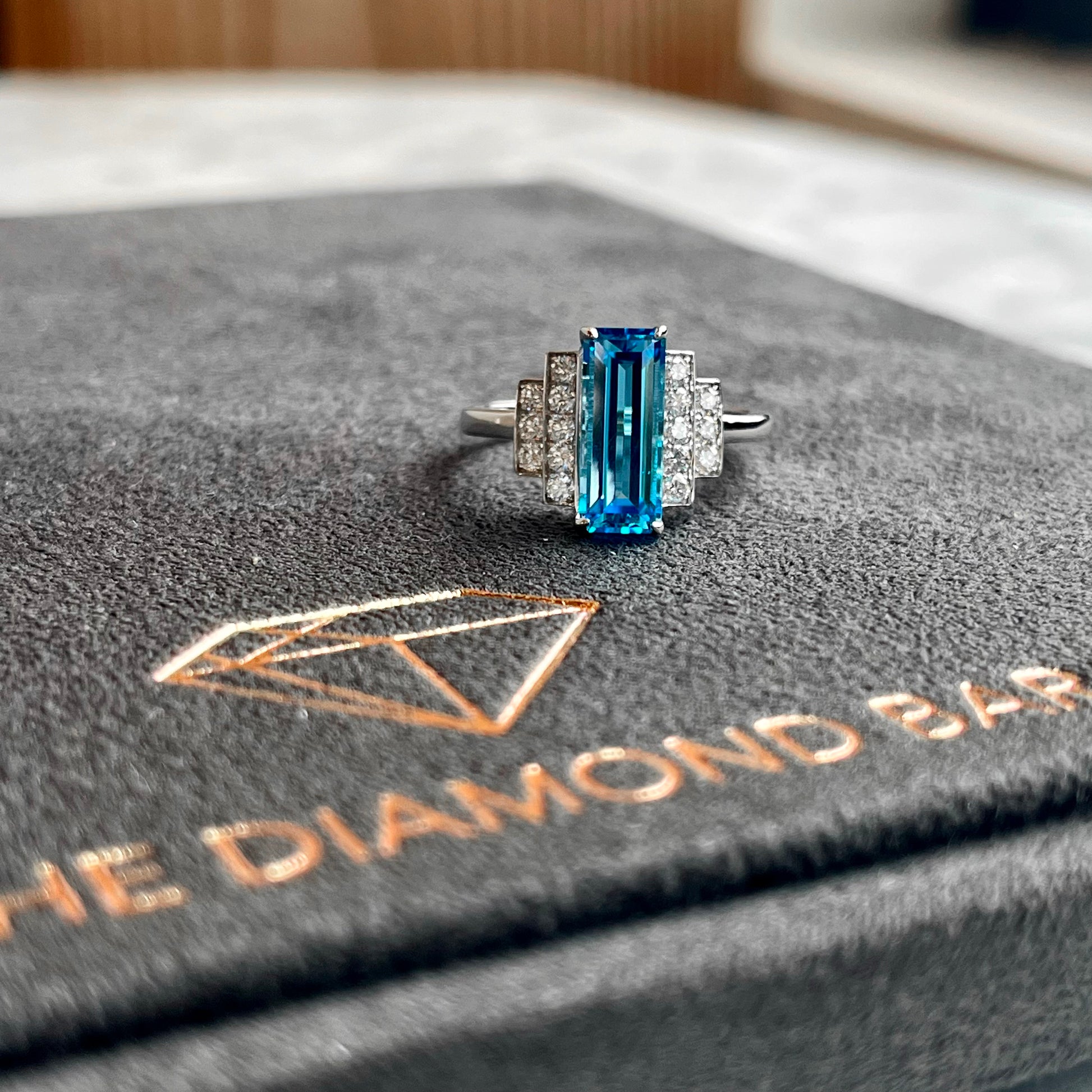 One (1) 14K white gold natural elongated blue topaz and diamond art-deco inspired ring 4-prong set with one (1) straight blue baguette cut topaz 1.88CT of fine blue color, even saturation and eye-clean. Diamond semi-mount is bead set with (16) natural round brilliant cut diamonds 32/100CTW of fine (G-H) color and (SI) clarity.