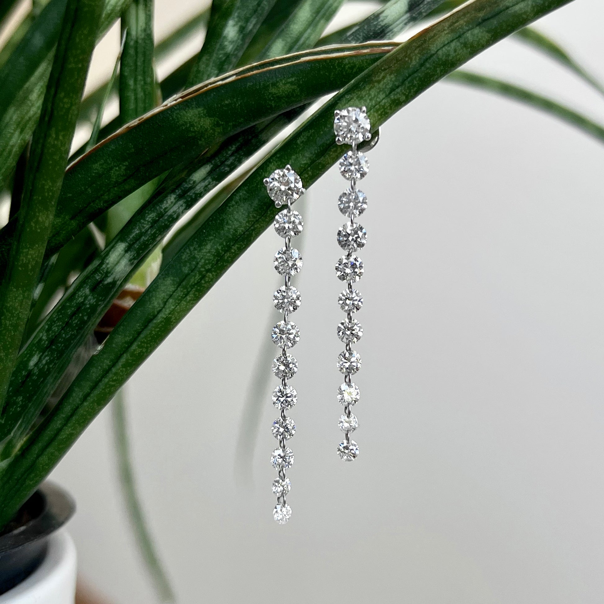 These 14K white gold gorgeous graduated diamond earrings feature 22 floating diamonds weighing 2.50CTW that sway and shine making them a stunning eye-catcher.