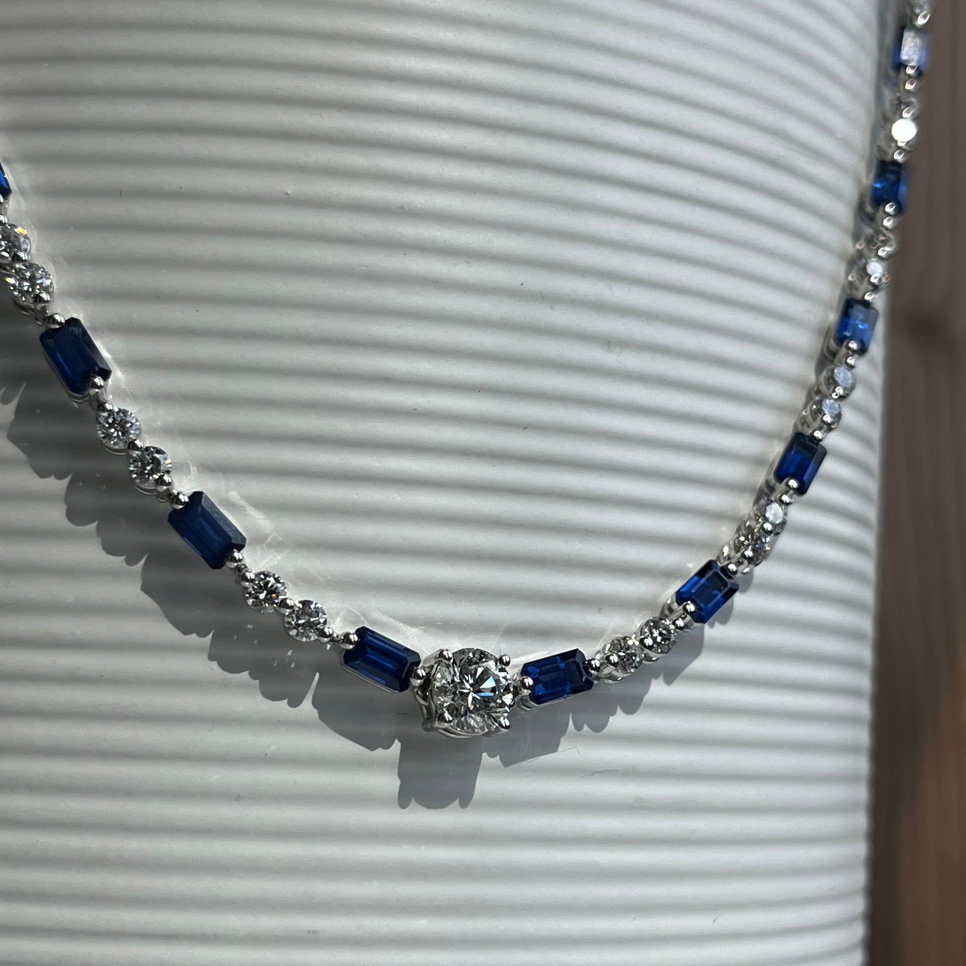 Expertly crafted, this custom 14K white gold necklace features a stunning 78/100CT round brilliant cut diamond at its center. Accentuated by 12 natural blue sapphires and 24 round brilliant cut diamonds, totaling 4.55CTW and 1.96CTW respectively, this riviera necklace is a truly luxurious piece. Completed with a hidden box clasp.