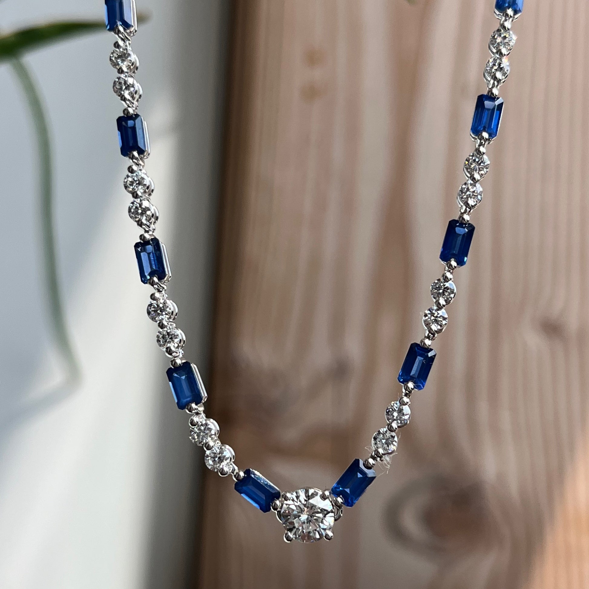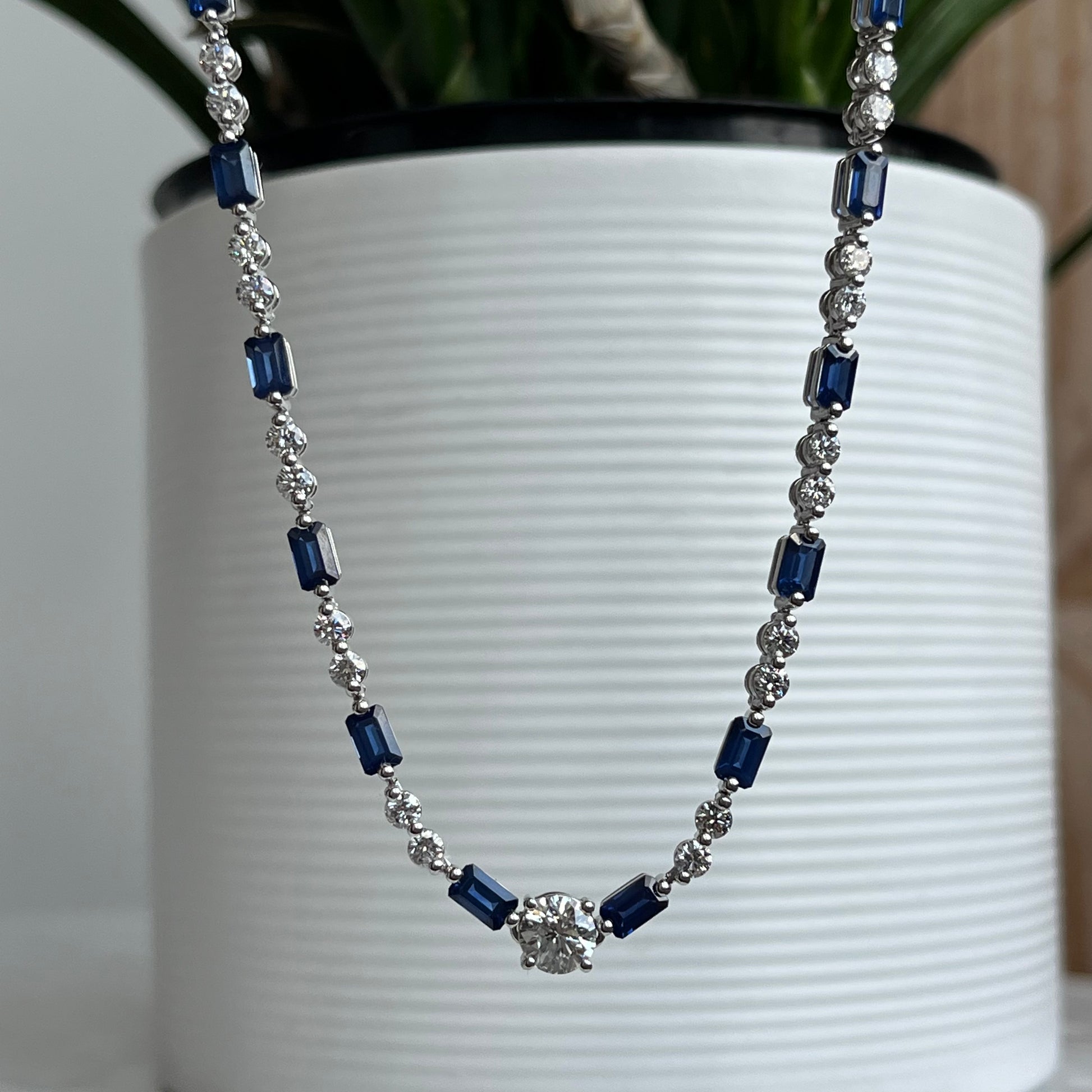 14K White Gold Diamond and Sapphire Riviera Necklace