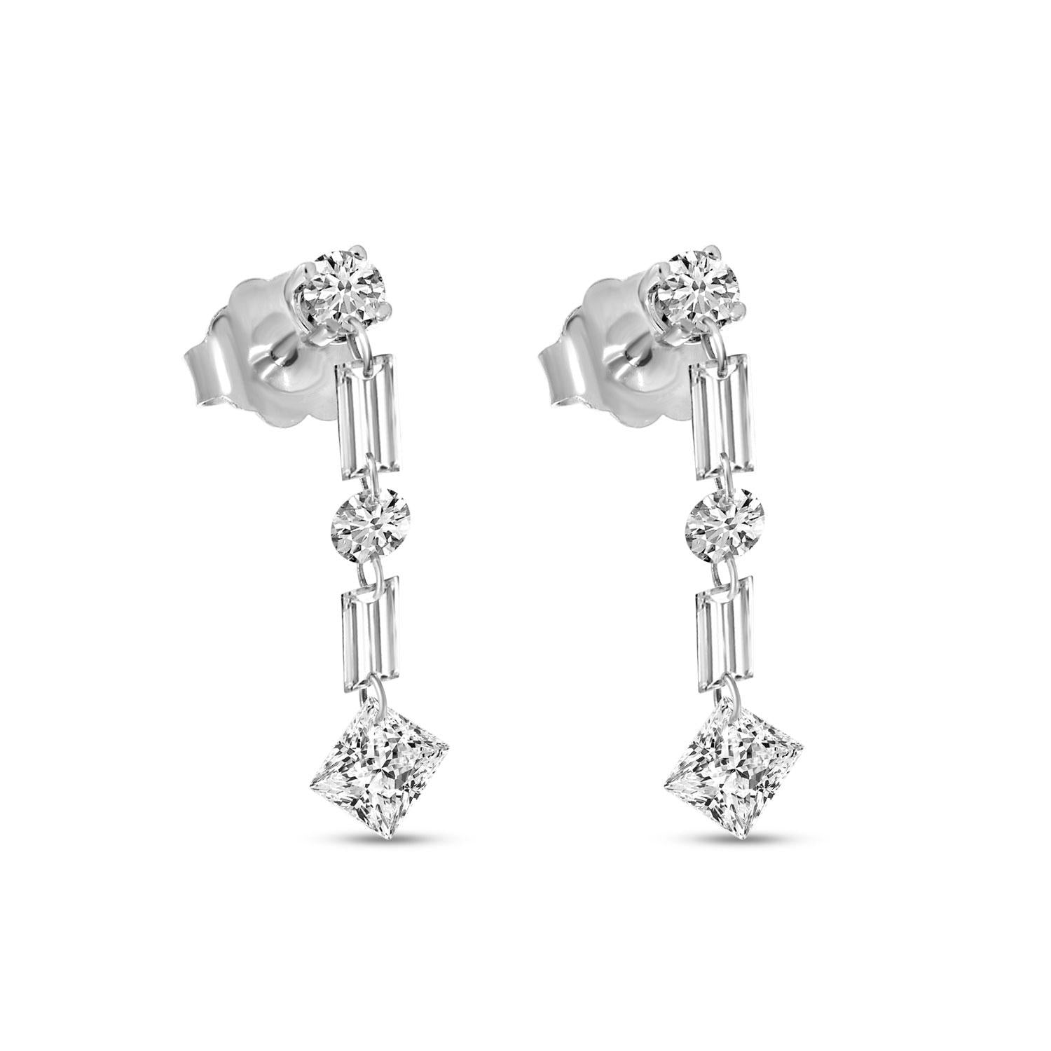 14K White Gold Floating Baguette, Princess and Round Diamond Earrings