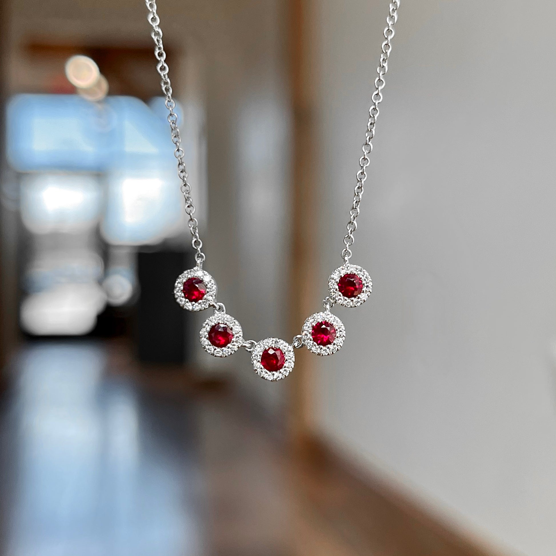 14K White Gold Ruby and Diamond Five Stone Necklace 65/100CTW