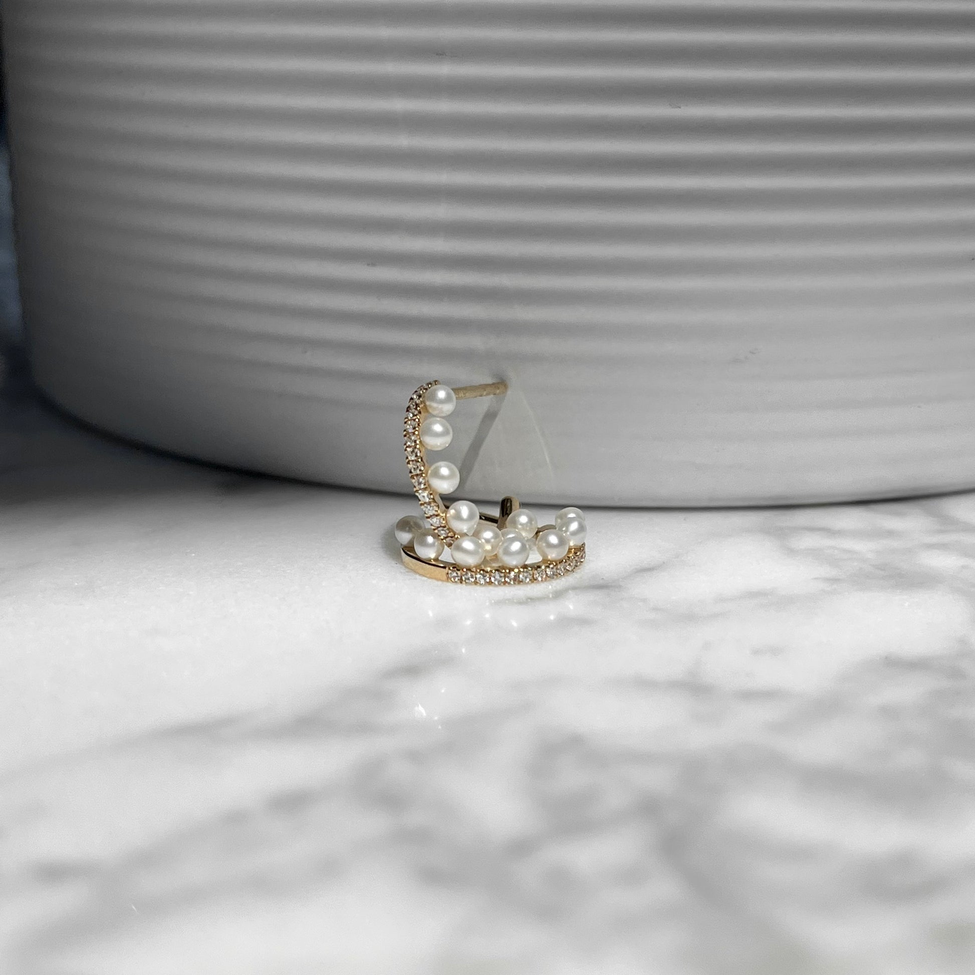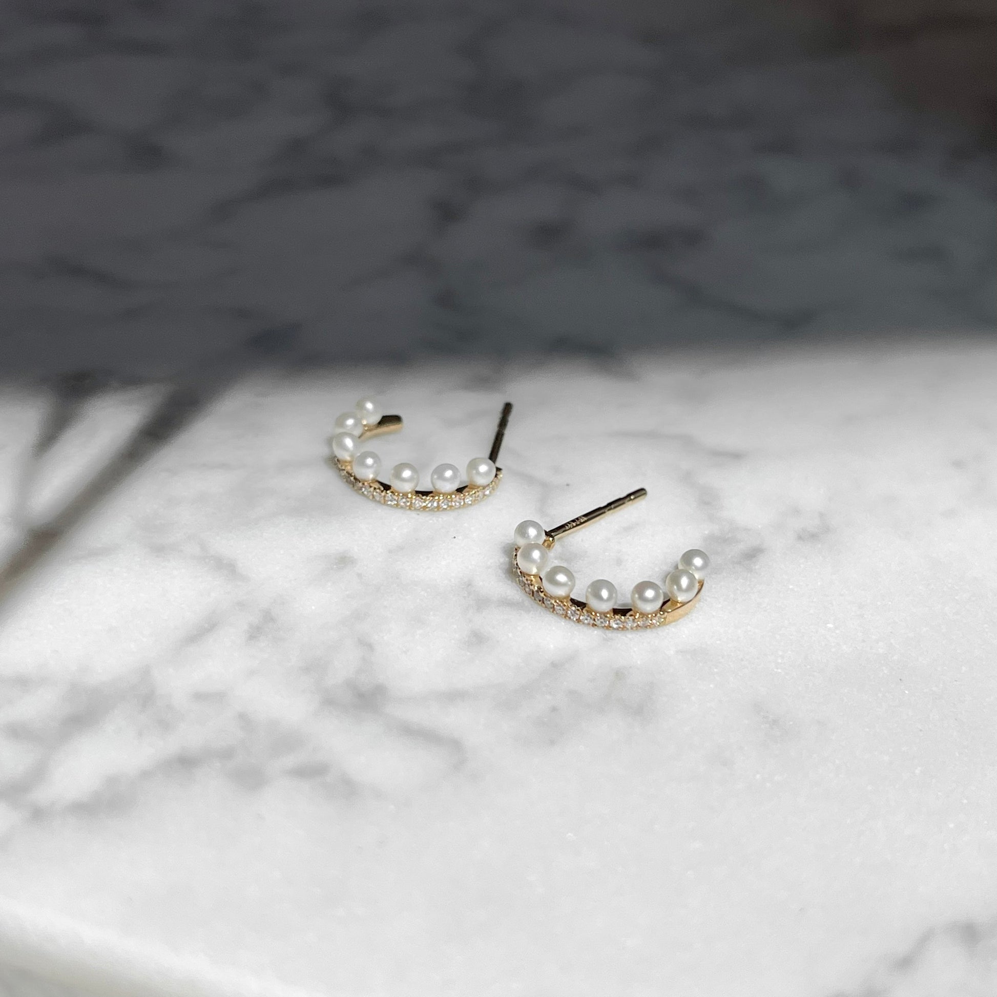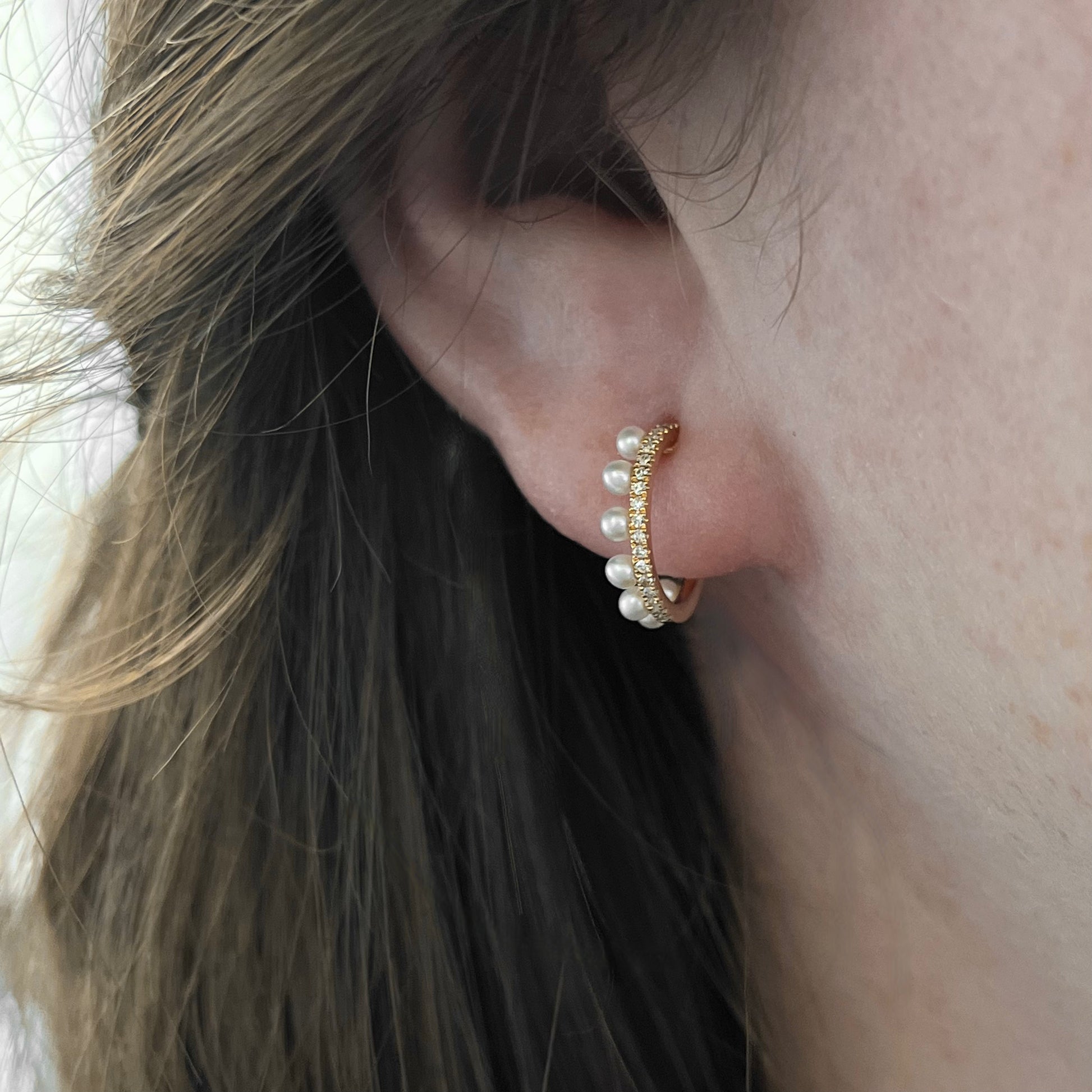 14K Yellow Gold Asymmetrical Diamond and Pearl Huggie Hoop Earrings