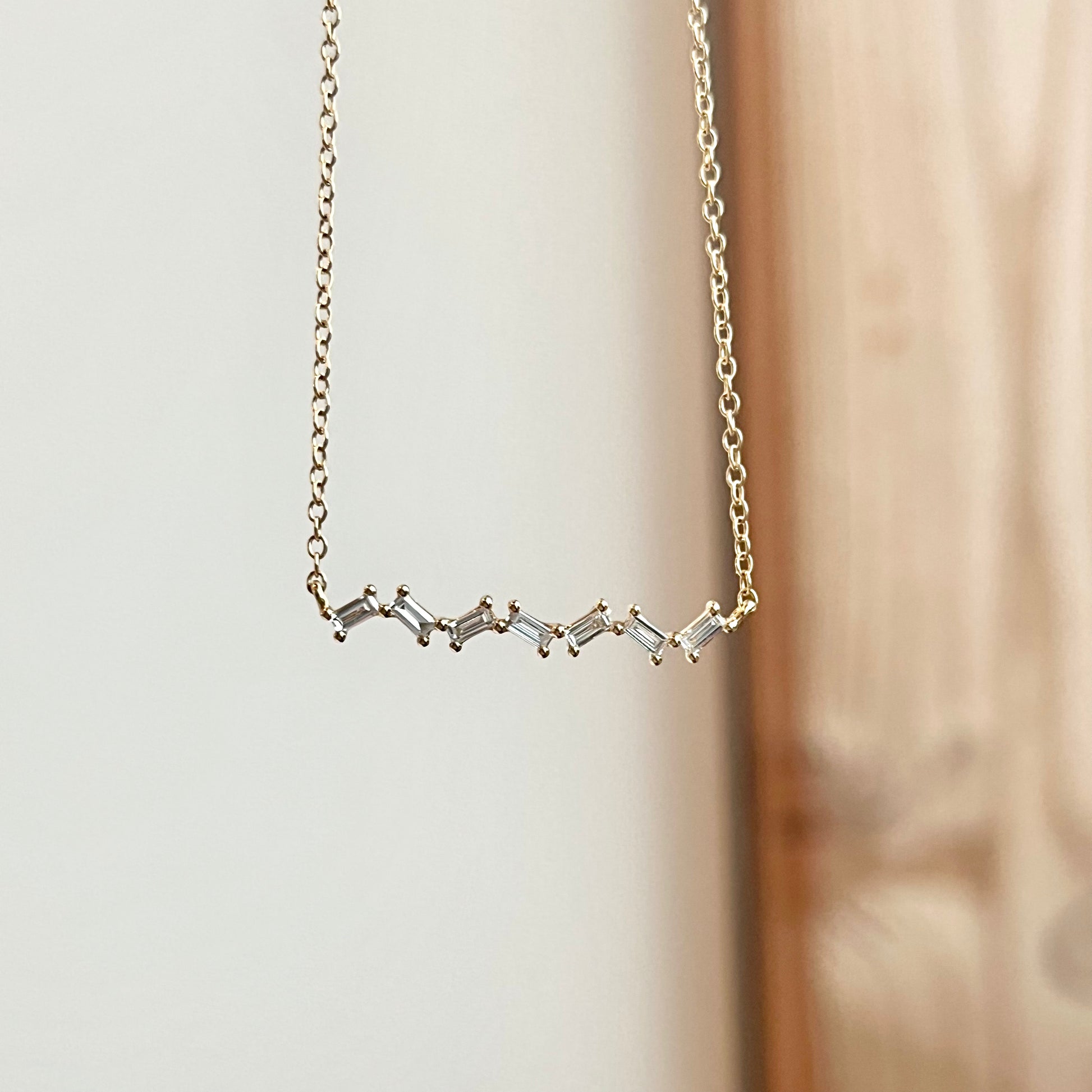 One (1) 14K yellow gold baguette staggered bar necklace prong set with (7) straight baguette diamonds 25/100CTW of fine (F-G) color and (VS) clarity stationed on a 16-18 inch cable chain with lobster clasp.