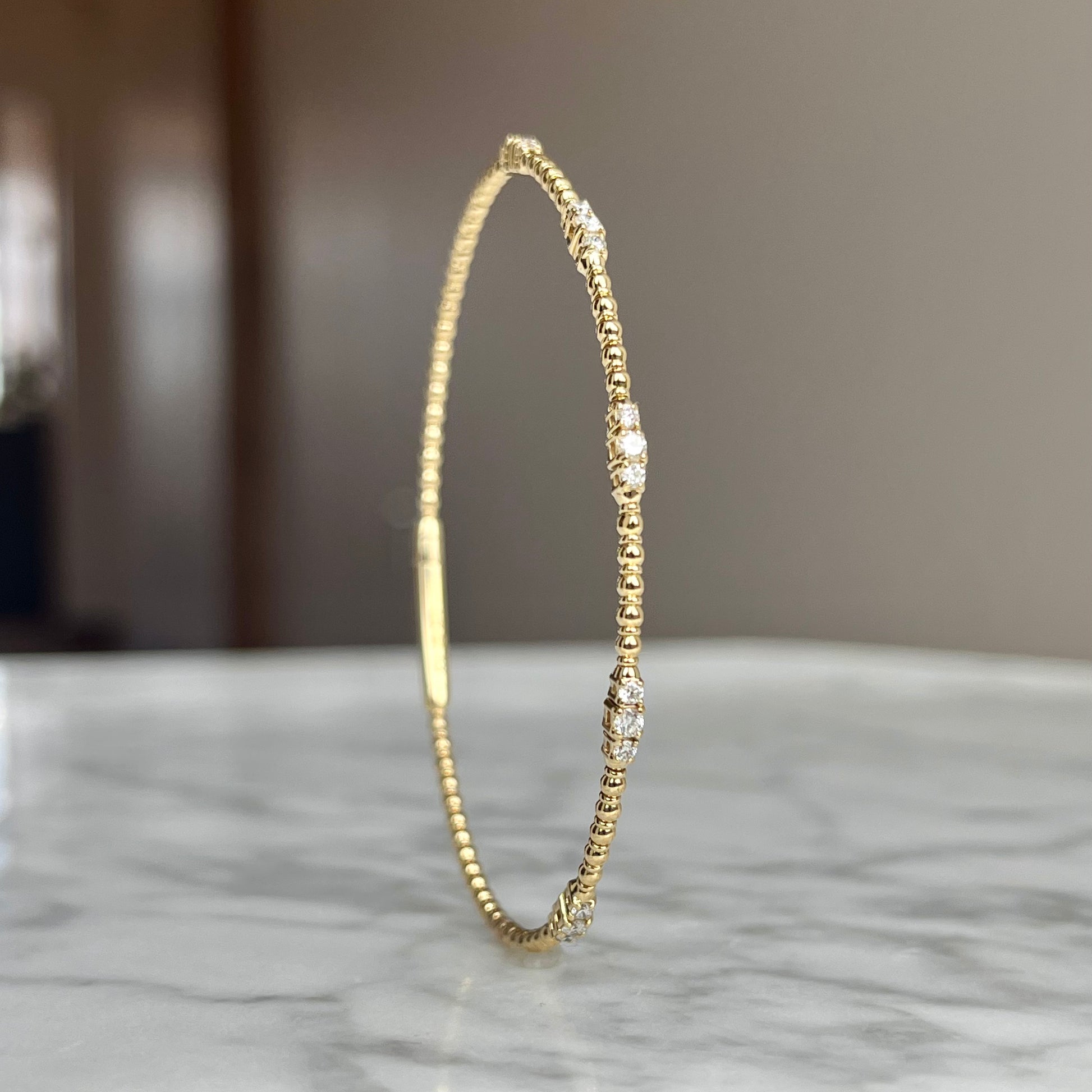 This 14K yellow gold bangle bracelet features 15 round brilliant cut diamonds of fine color and clarity, totaling 36/100 carats. Its flexible design and beaded details add a touch of elegance to any outfit.