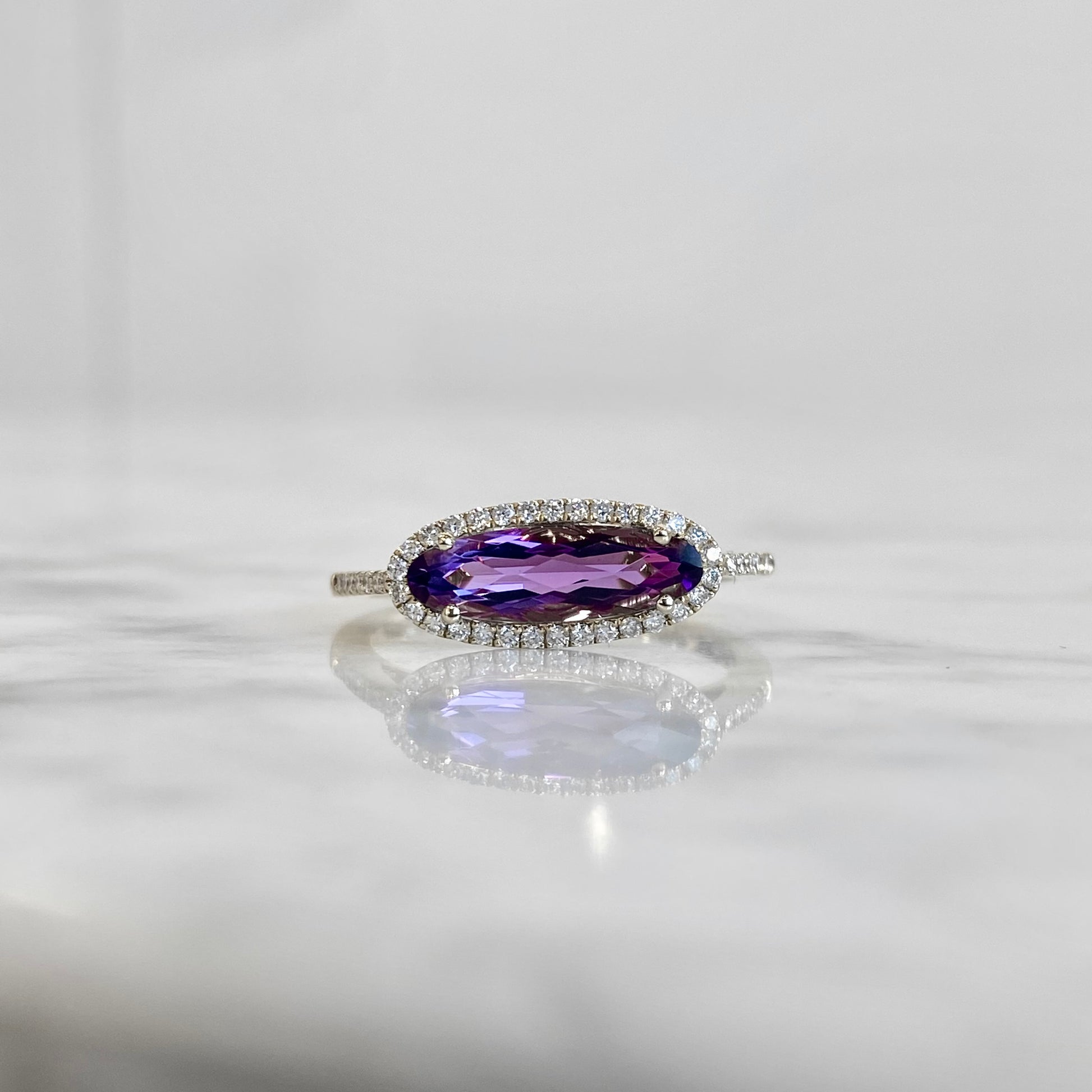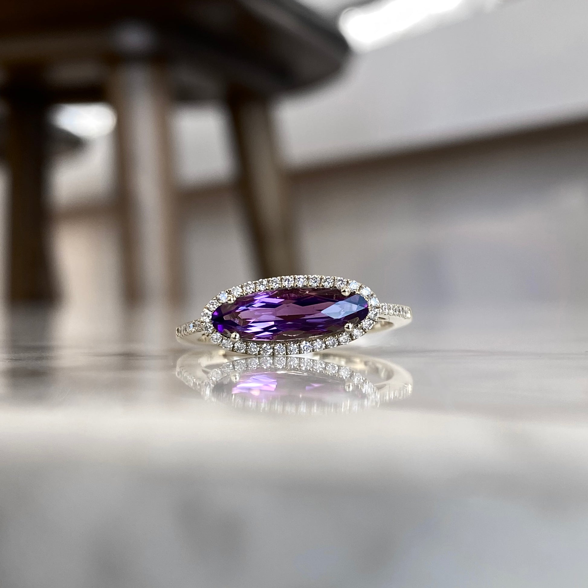One (1) 14K yellow gold elongated oval amethyst and diamond halo ring prong set with one (1) east/west set 11x4 oval cut amethyst of fine purple color and even saturation and (44) round brilliant cut diamonds 15/100CTW of fine (G-H) color and (SI) clarity.