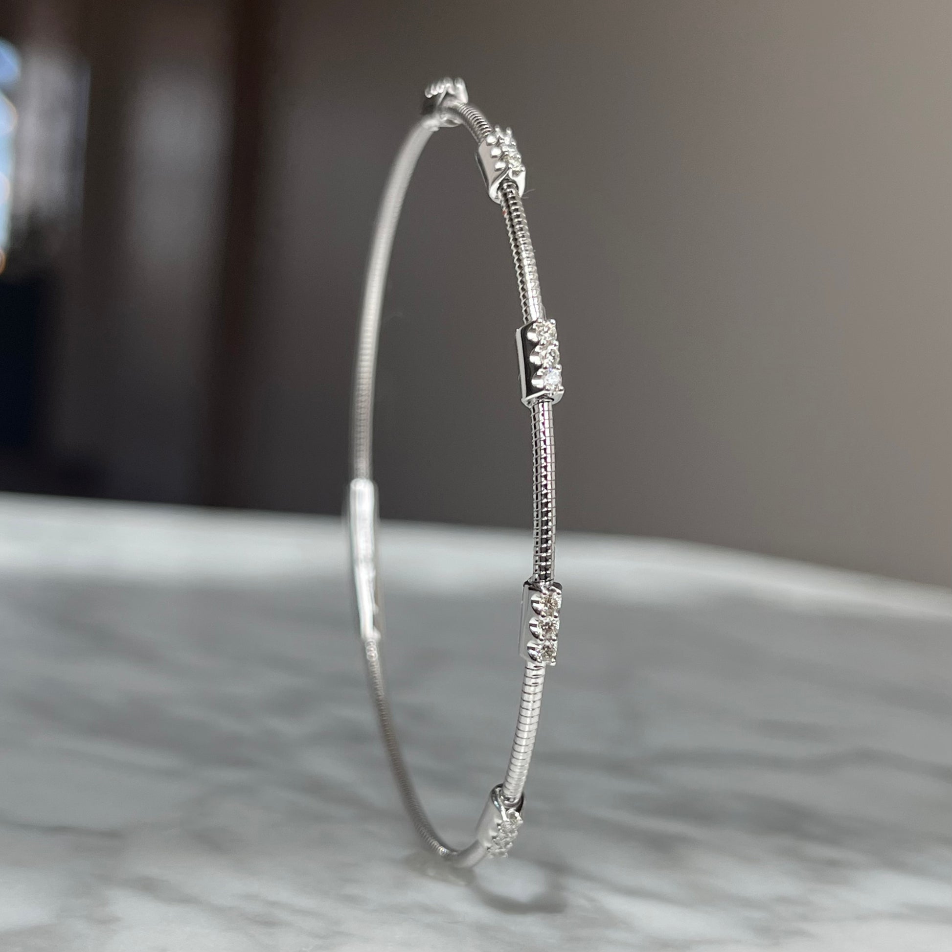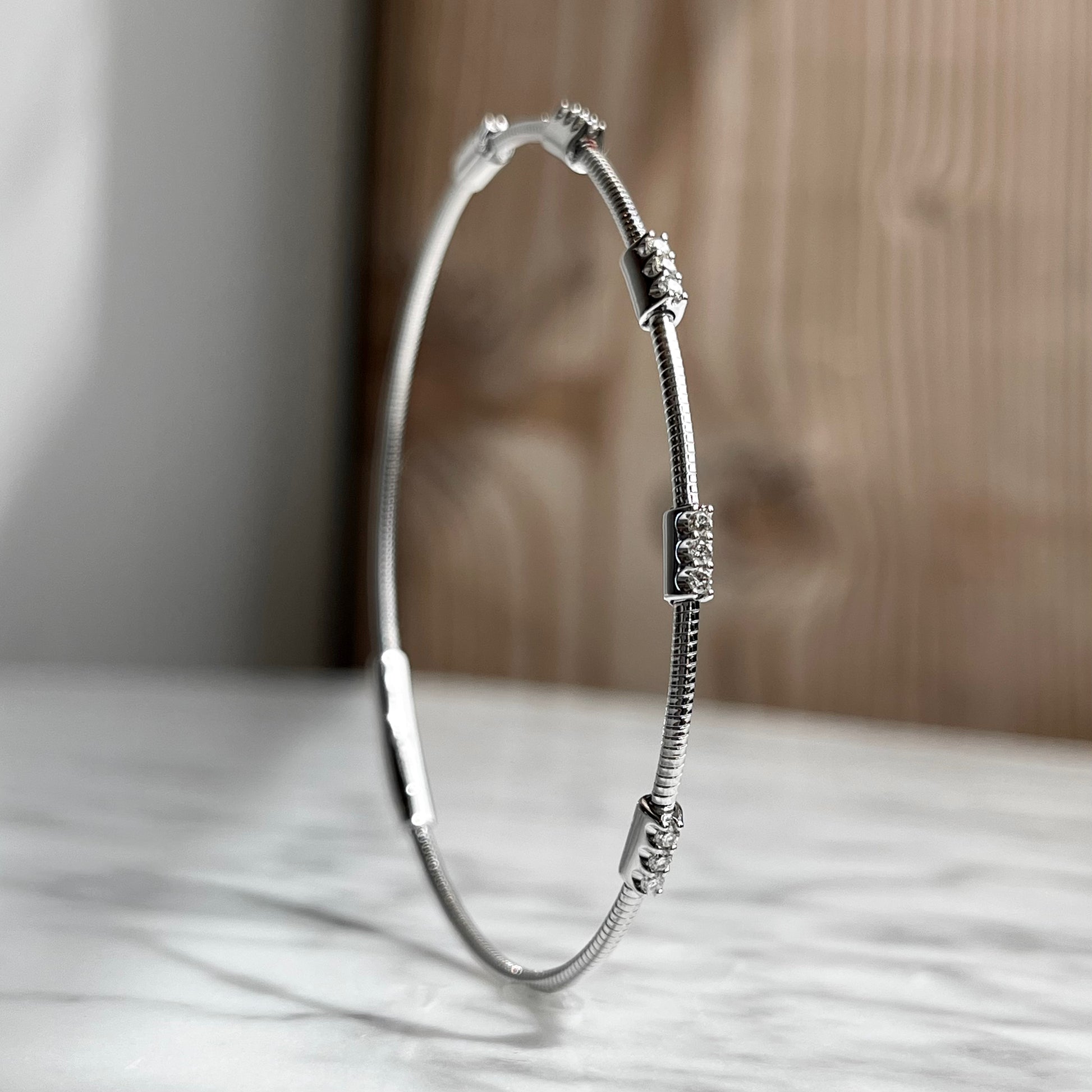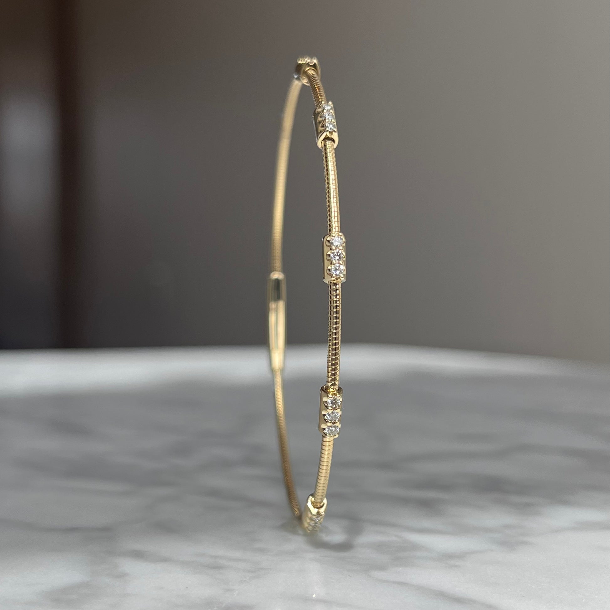 This 14K gold flexible diamond bracelet features 1/5CTW and 15 round brilliant cut diamonds with fine G-H color and SI clarity. The bangle design allows for easy and comfortable wear. Elevate any outfit with this stunning and versatile piece.