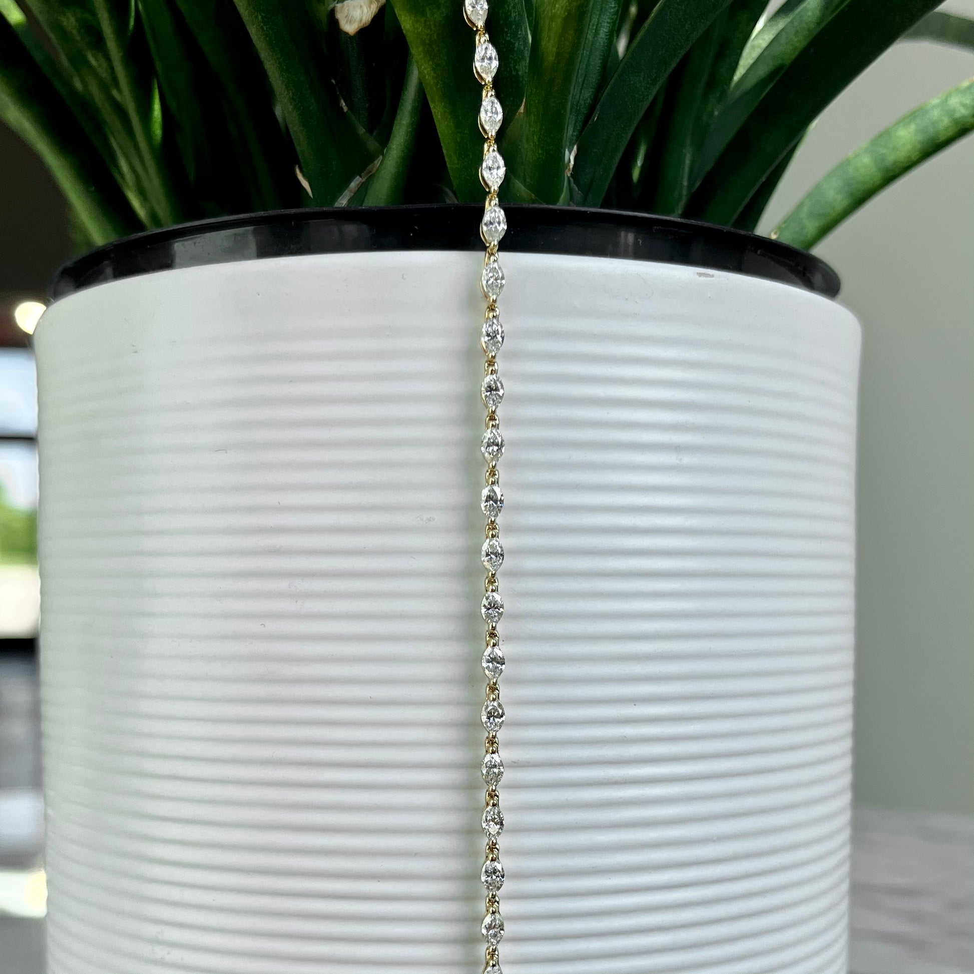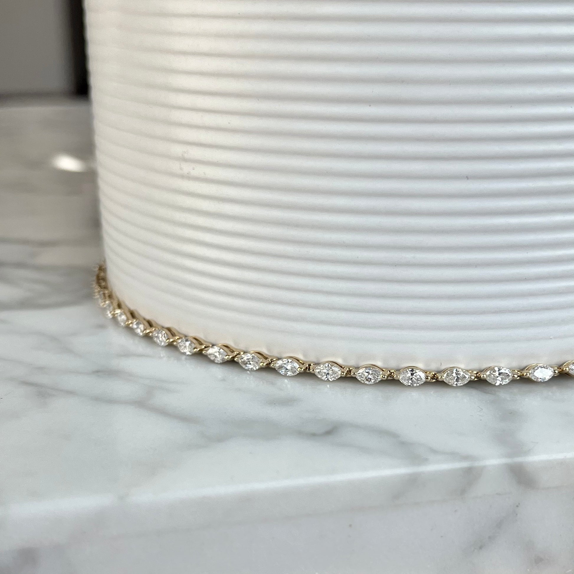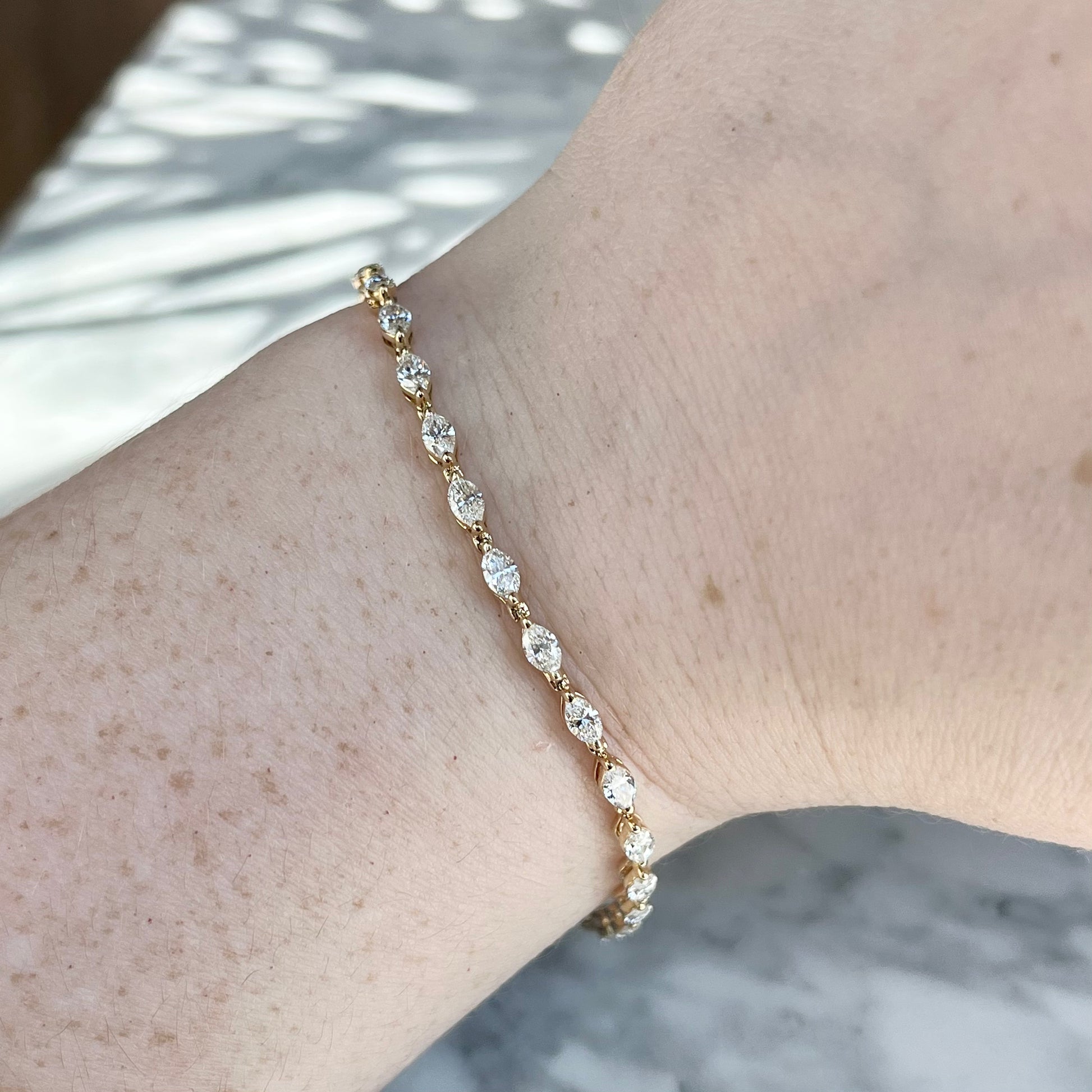 This stunning 14K yellow gold marquise diamond bracelet features 30 natural marquise cut diamonds totaling 3.10CTW, G-H in color and SI in clarity. Each diamond is single prong set for a sleek and classic look, with a hidden safety latch clasp for peace of mind. A truly timeless piece.