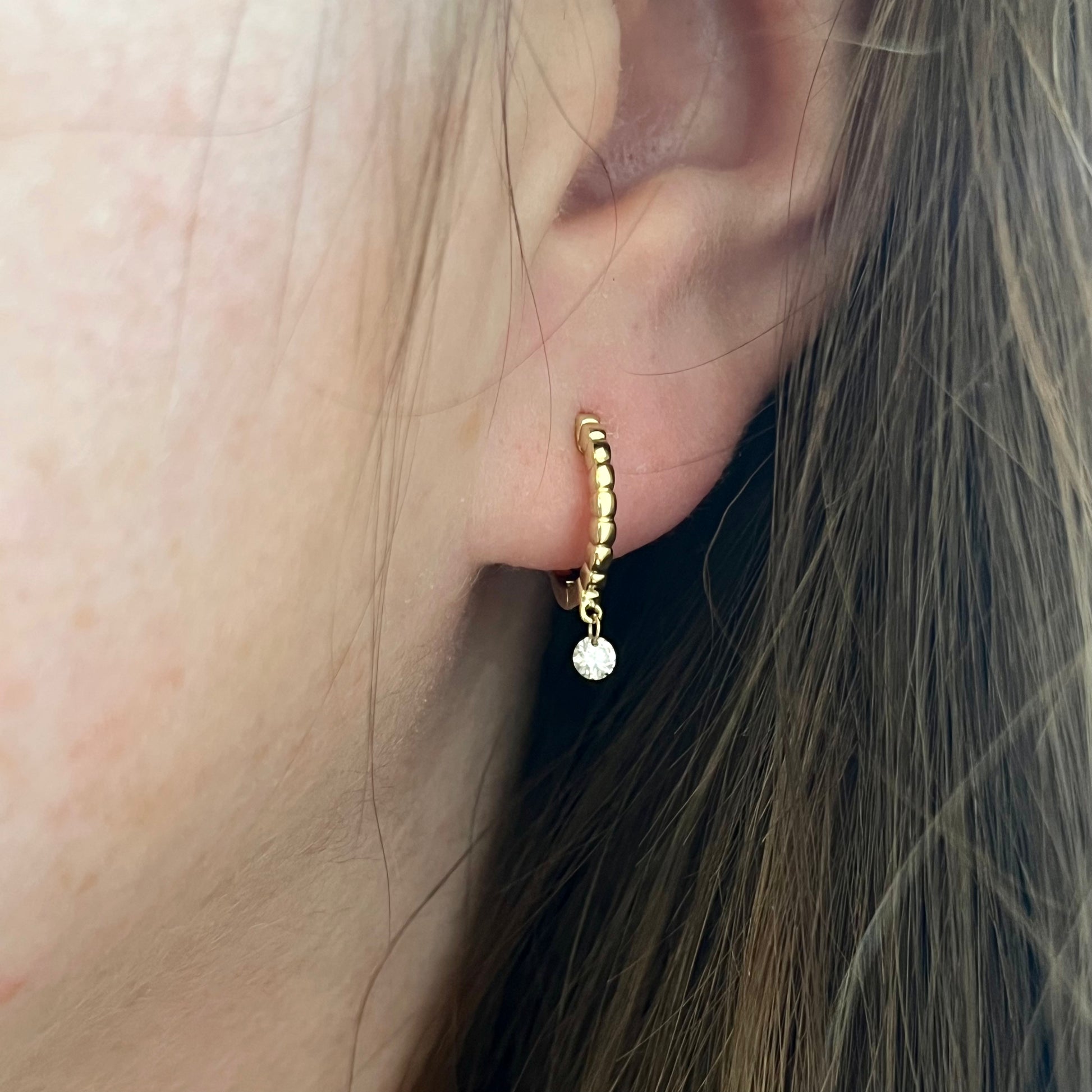 Introducing our 14K yellow gold textured floating diamond huggie hoop earrings, adorned with (2) round brilliant cut floating diamonds weighing 16/100CTW. The fine diamonds boast a quality of (G-H) color and (SI) clarity. With hidden hinge clasps, these earrings offer both elegance and convenience.