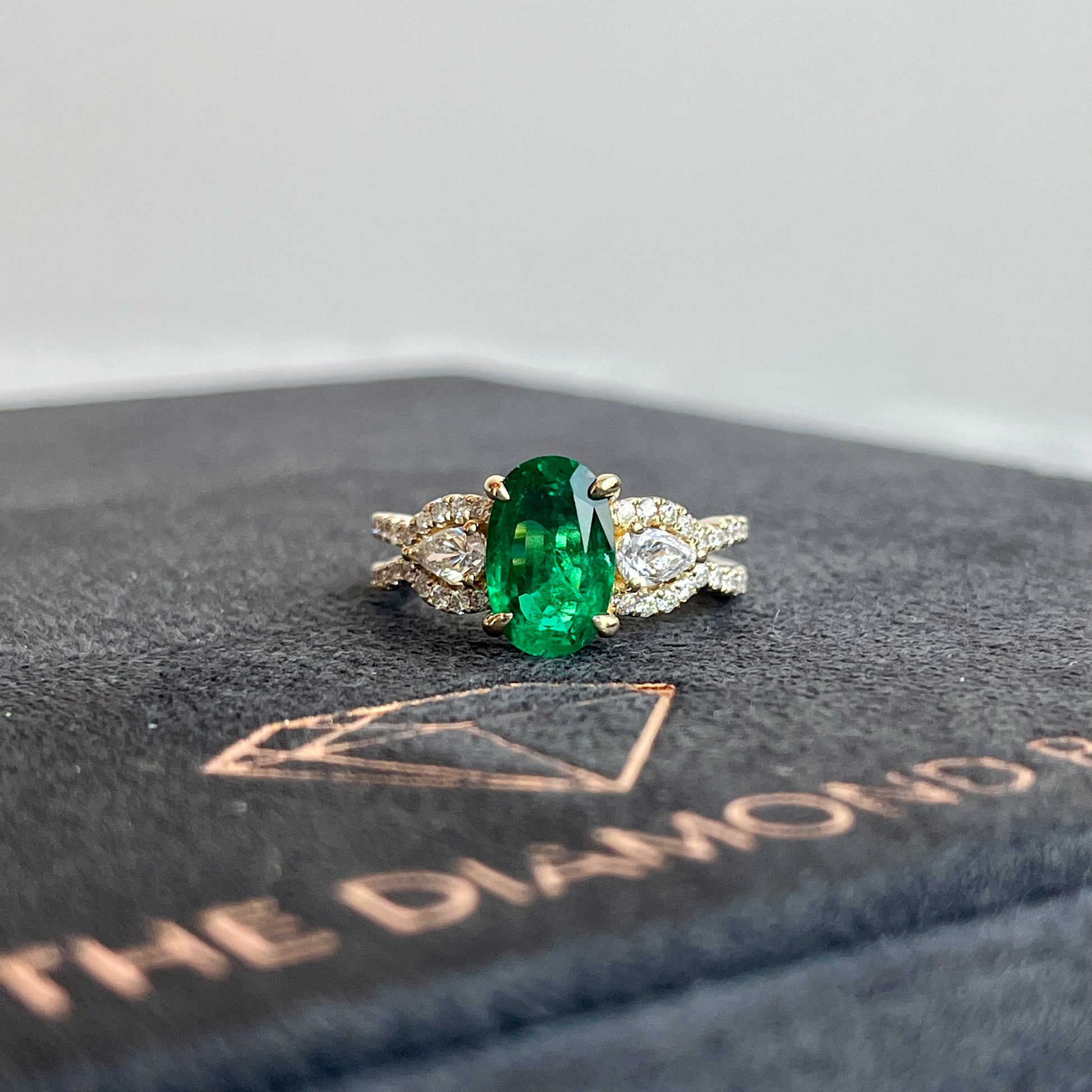This stunning ring features a natural 1.80CT oval cut emerald, surrounded by two pear shape diamonds and forty round brilliant cut diamonds. The 14K yellow gold band adds elegance and the split shank design enhances the overall beauty. A unique and luxurious choice for any occasion.