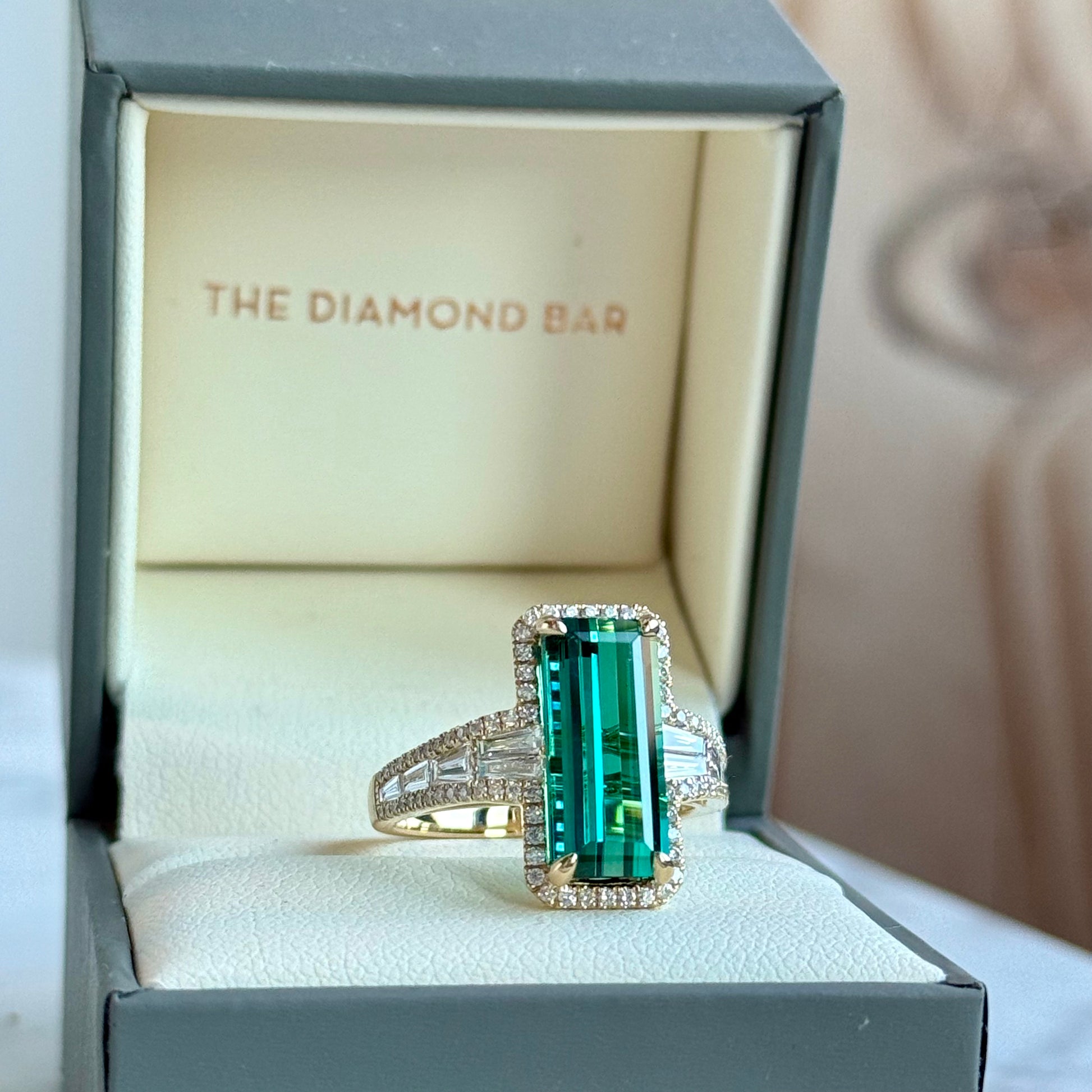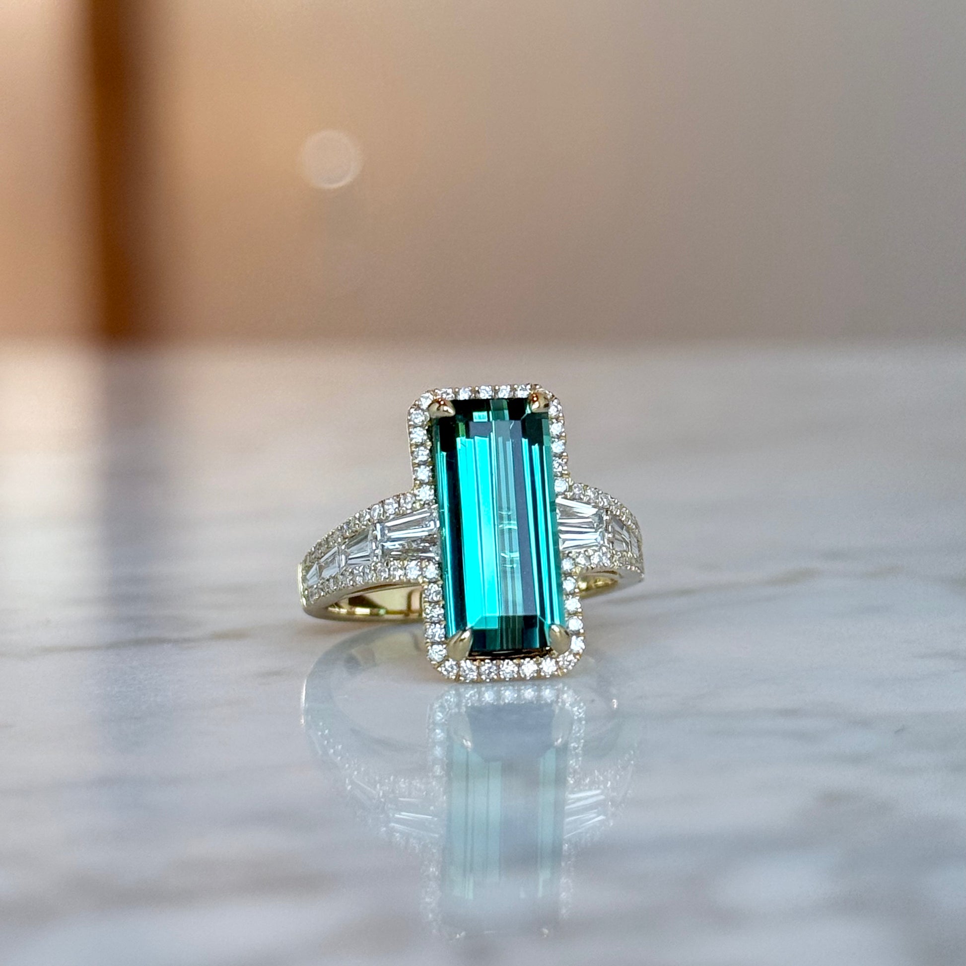 This stunning 14K yellow gold ring features a breathtaking 5.54-carat emerald-cut tourmaline in a rich greenish-blue teal hue, perfectly complemented by a sparkling diamond halo. The center stone is eye-clean with excellent saturation and precision cutting (14.35 x 6.83 x 4.91mm). Eighty-six round brilliant diamonds (29/100 CTW, F-G color, VS clarity) frame the tourmaline and cascade down the shank's sides, while ten tapered baguette diamonds (56/100 CTW, F-G color, VS clarity) line the inner channel for added brilliance. A timeless four-prong semi-mount design showcases the tourmaline's natural beauty while maximizing light and sparkle from every angle.