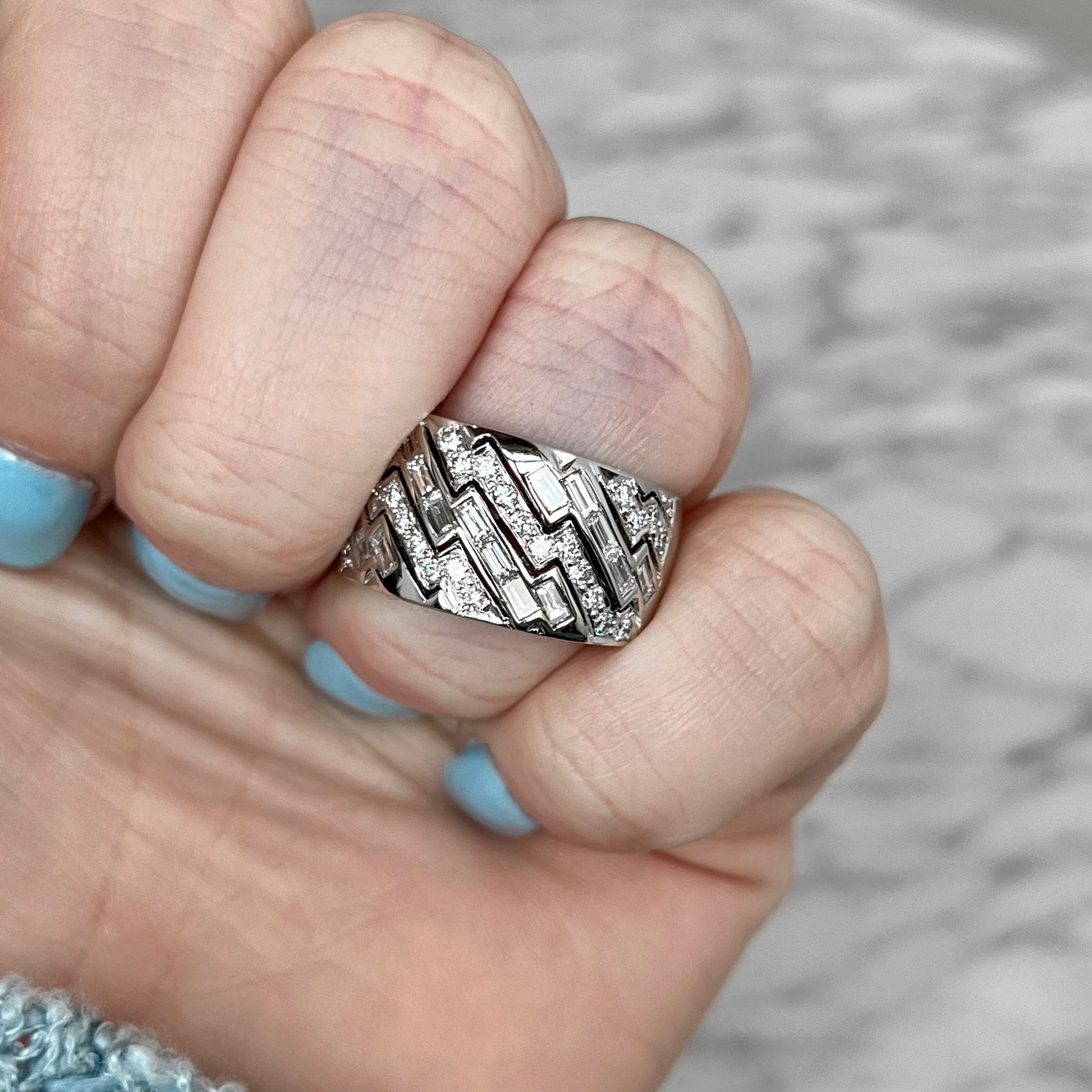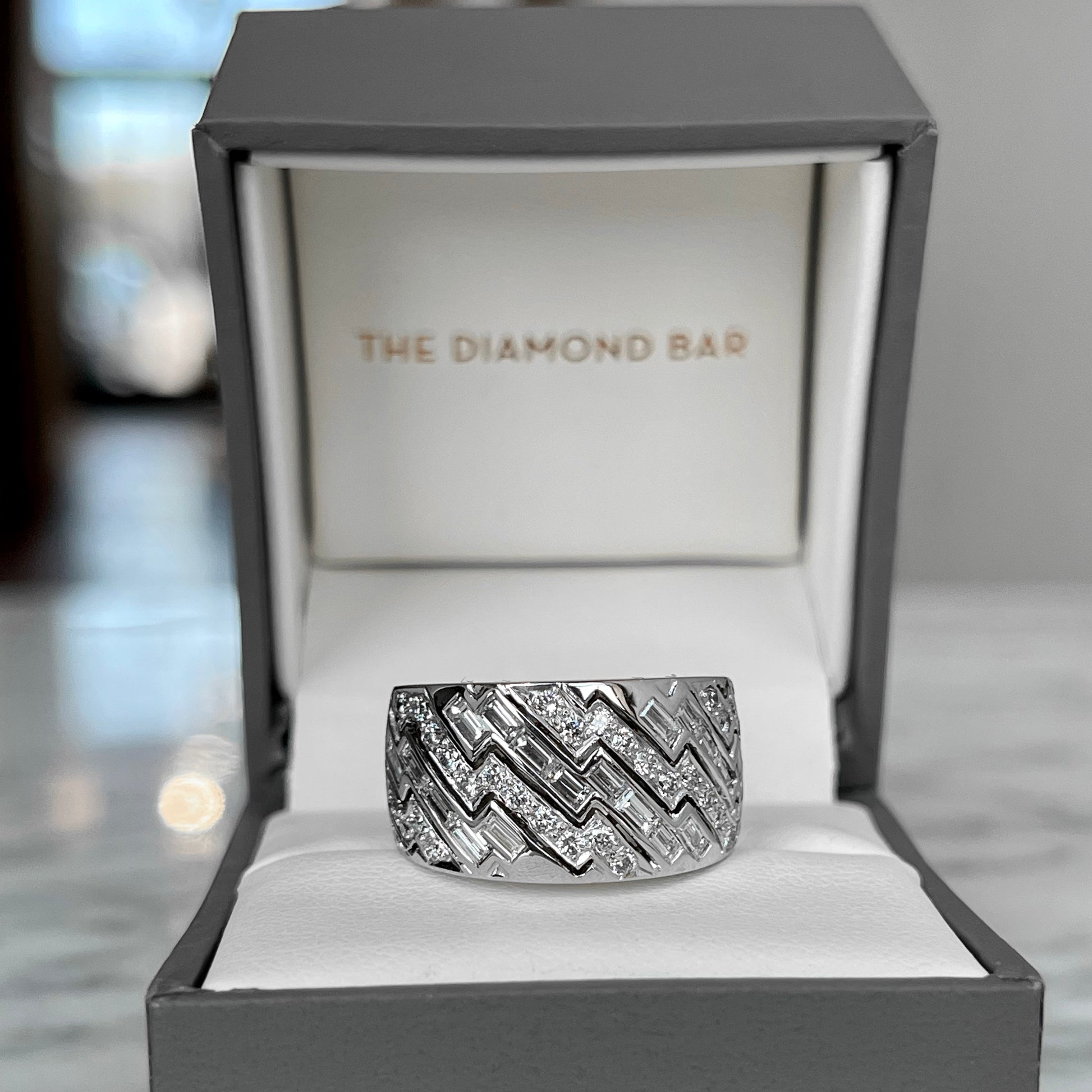 Elevate your style with our stunning 18K white gold baguette and round diamond anniversary band. Channel set with 18 natural straight baguette cut diamonds and 32 natural round brilliant cut diamonds, this band boasts 1.30CTW of fine (G-H) color and (VS) clarity. Make a bold statement with this exquisite piece!