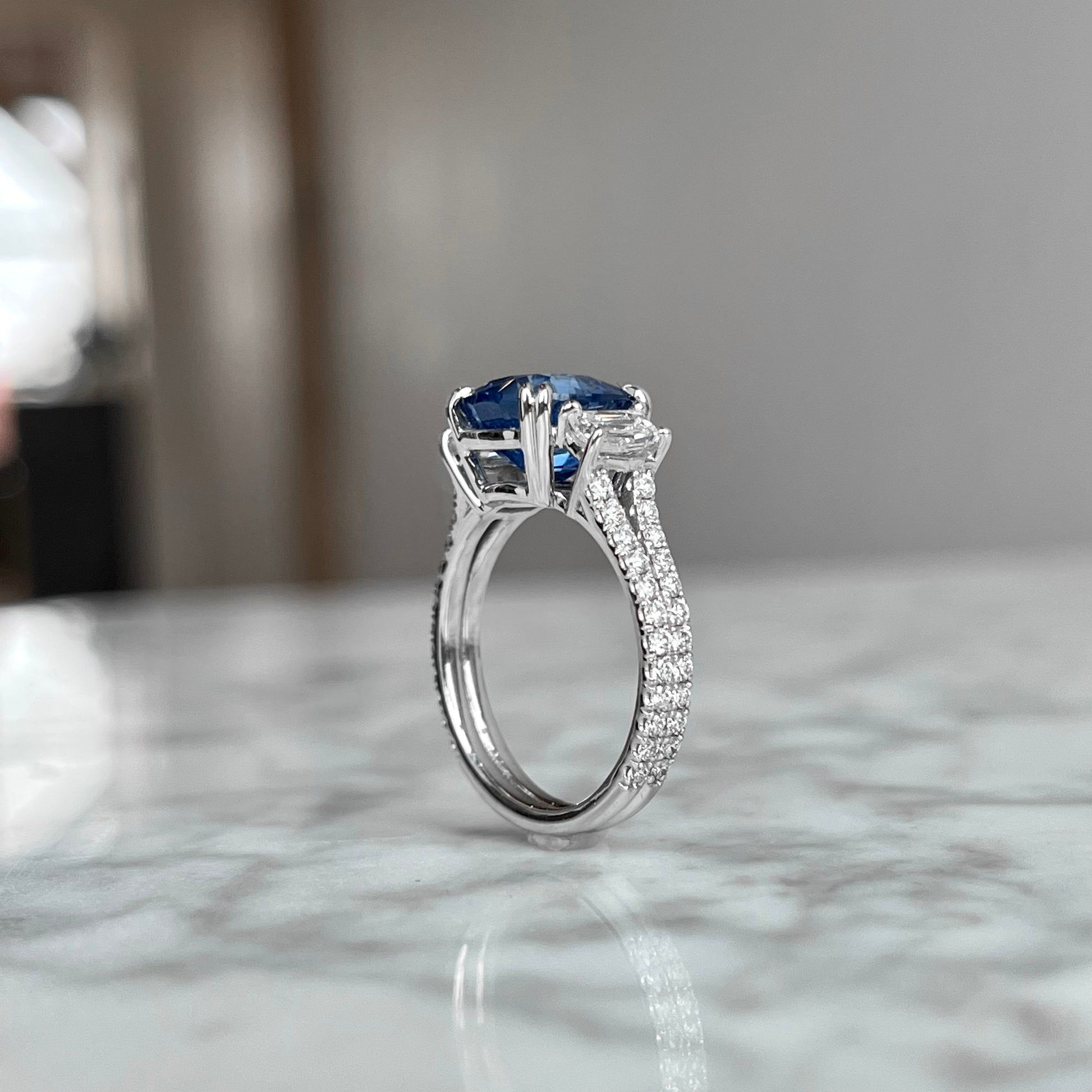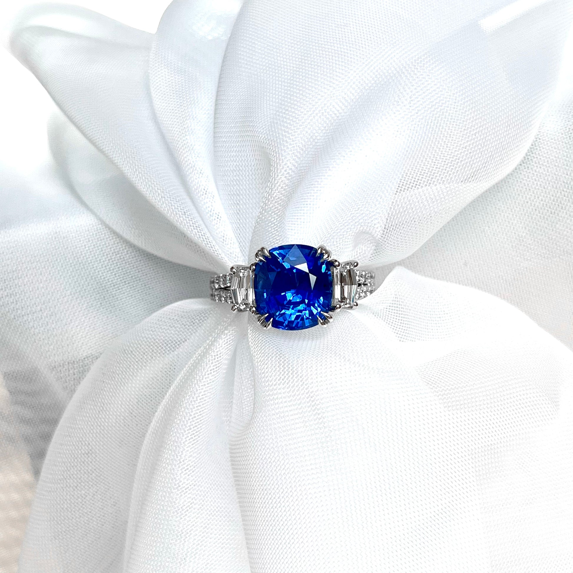 This stunning 18K white gold sapphire and diamond ring features a 4.37CT cushion cut blue sapphire with fine color and saturation. The diamond semi-mount is prong set with two Epaulette "Cadillac" cut diamonds and 48 round brilliant cut diamonds, all of exceptional quality. Enhance your style with this eye-catching ring.