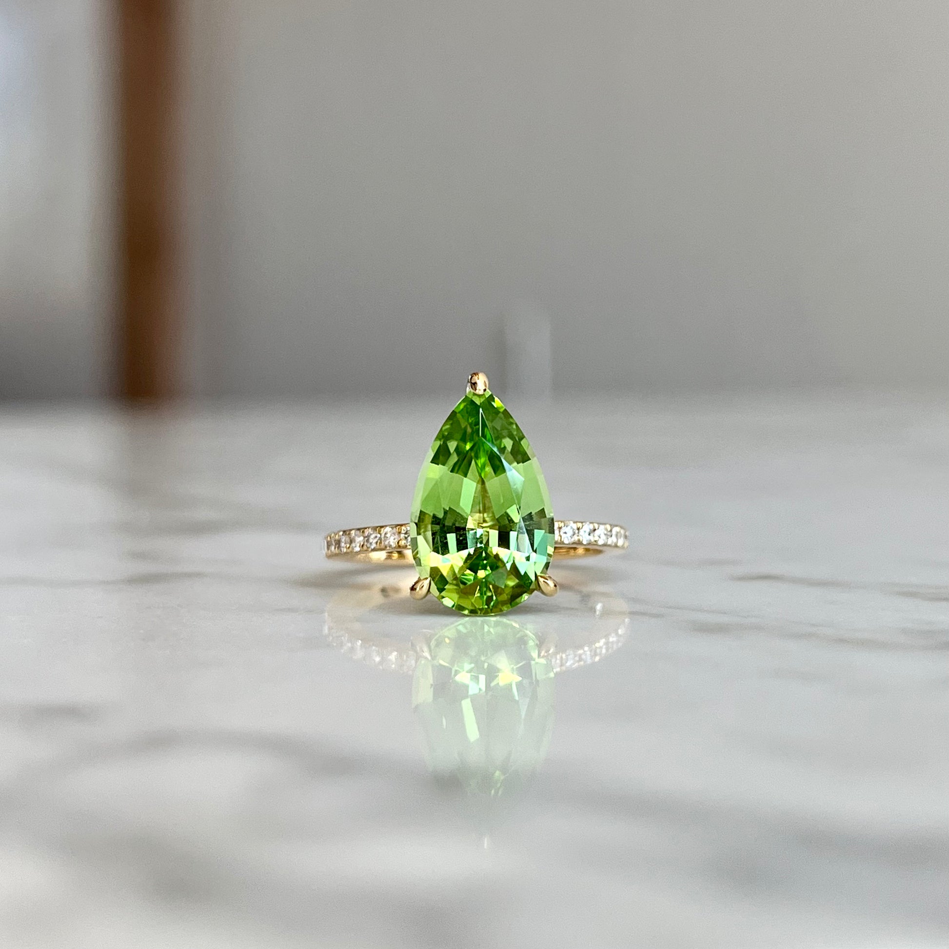 Indulge in luxury with our 18K yellow gold hidden halo peridot ring. Featuring a stunning center pear-shaped peridot at 4.50CT with deep lime green color and even saturation. Accompanied by a diamond semi-mount with 51 natural round brilliant cut diamonds at 57/100CTW, creating a hidden halo, under-gallery, and half-way down the shank. Add a pop of elegant color to your style with this exquisite piece.