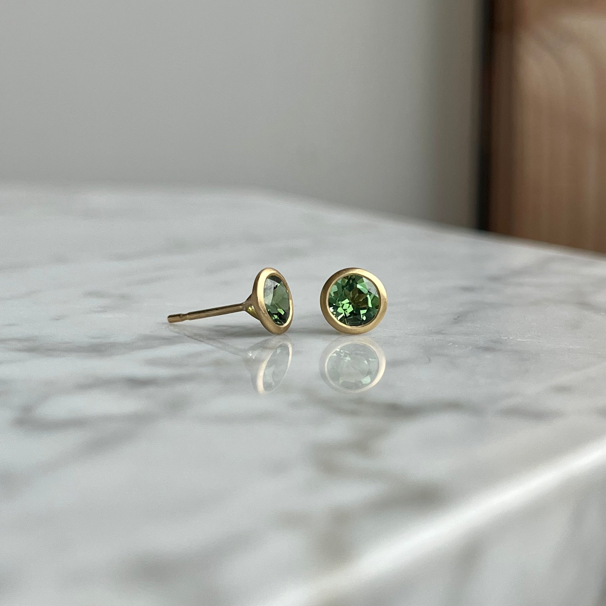 18K Yellow Gold Round Green Tourmaline stud Earrings