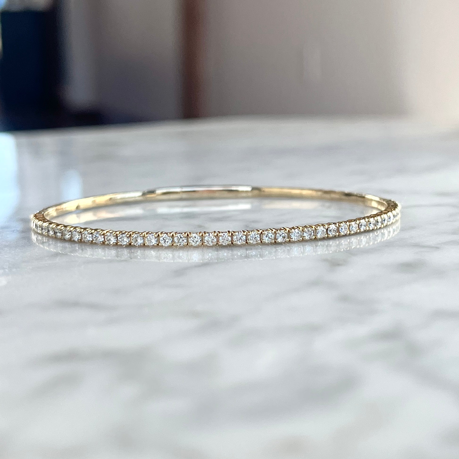 This 14K gold flexible bangle bracelet boasts 41 natural round brilliant cut diamonds, totaling 1.00CTW. The 4-prong setting offers secure and elegant placement of each diamond, creating a stunning piece of jewelry that will elevate any outfit. Enjoy the versatility and timeless beauty of this diamond bangle bracelet.