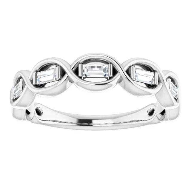 One (1) natural diamond baguette twisted stackable wedding band bar set with (7) straight baguette cut diamonds 1/4CTW of fine (G-H) color and (SI) clarity three quarters way down the shank.
