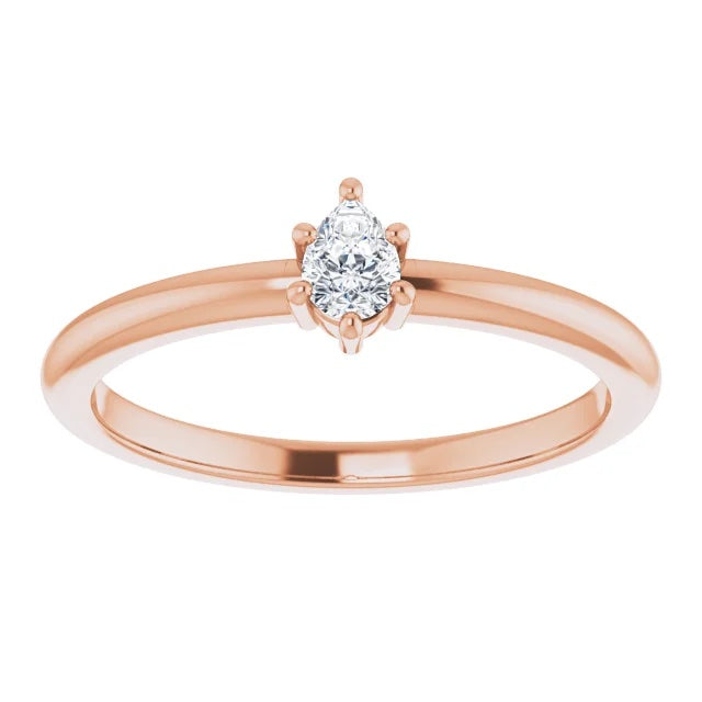 One (1) 14K Solitaire 6-prong petite 4 x 3mm natural diamond pear shape ring approximately 14/100CTW of fine (G-H) color and (VS) clarity.